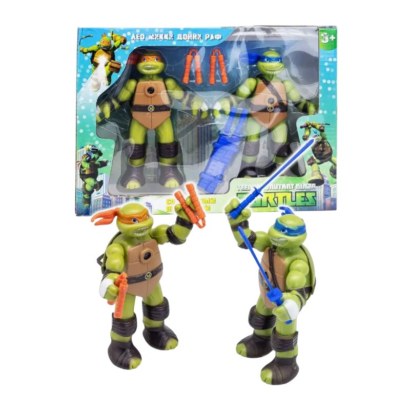 Teenage Mutant Bruņurupuči nindzjas - varoņu Leonardo un Mikelandželo figūras ar attēlu projektoru un ieročiem. Projektors tiek aktivizēts, nospiežot pogu figūras aizmugurē, ja pavērsiet to pret sienu, jūs redzēsiet mirdzošu varoņa attēlu. Figūra ir pozējama, ar kustīgām rokām.