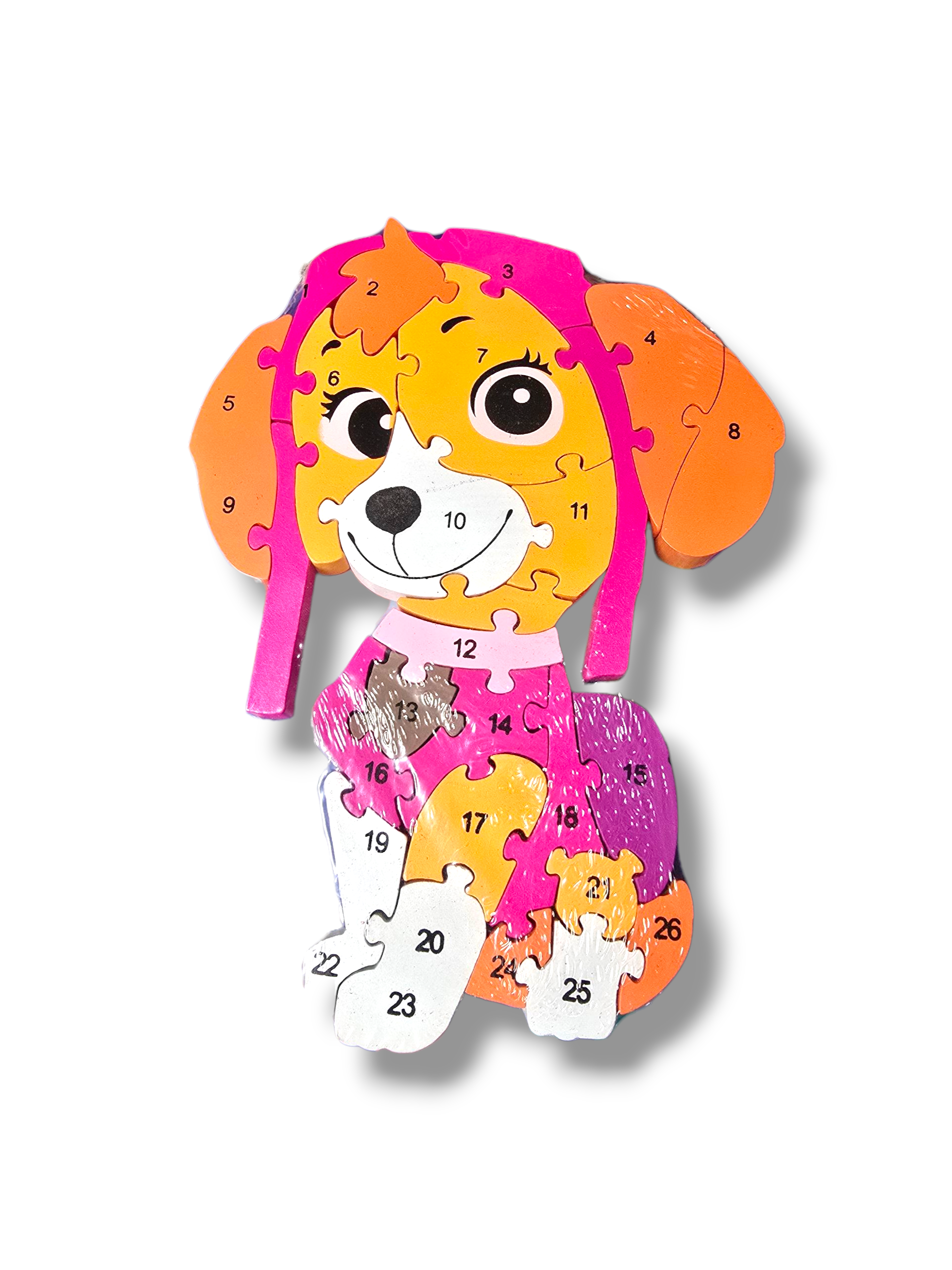Vienā pusē puzlei atrodas cipari un otrā burti kas palīdz bērnam mācīties ciparu un burtu secību.