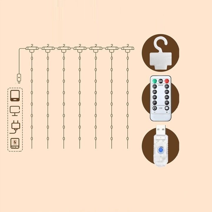 Pateicoties LED aizkaru virtenei Jūs varat radīt brīnišķīgu atmosfēru savās mājās. Lieliski iederēsies gan kā papildus apgaismojums gan arī svētku dekors. Ar tālvadības pulti var pārslēgt virtenes režīmu, ieslēgt un izslēgt to, kā arī iestatīt taimeri, lai lampiņas pašas ieslēgtos un izslēgtos Jums vēlamajā laikā. Lampiņas var pieslēgt caur USB (pie barošanas bloka, portatīvā datora utml.) gan arī 220V rozetē, jo komplektā ir adapteris.